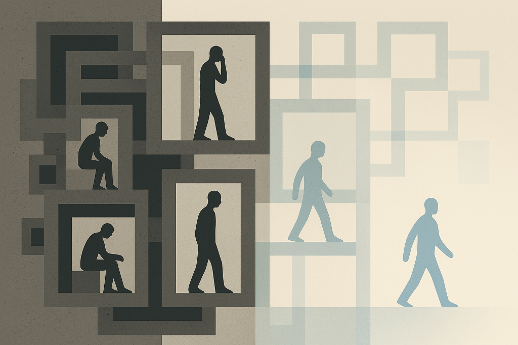 Dieses Muster zeigt sich nicht nur im breiteren gesellschaftlichen Kontext, sondern spiegelt sich auch in den individuellen Lebensgeschichten wider: Voreilige Urteile, Fragmentierung und sich wiederholende Zyklen der Trennung sind allgegenwärtig, selbst in den unscheinbarsten Situationen des Alltags.